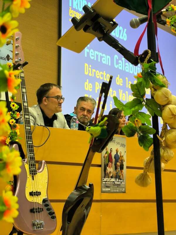 El moment més esperant per la xicalla present a l’acte ha sigut el colofó. El músic Paco Arroyo, integrant de Canta Canalla, ha presentat la cançó oficial d’enguany i, seguidament, ha ofert un xicotet concert amb la resta del grup. Xiulaballariu és “una marxa a tempo andante, festiva i participativa” pensada per a “ser cantada en grup, corejada i viscuda al carrer”. La cançó, ha explicat, convida a preparar motxilles, cridar els amics i celebrar el valencià com a espai de convivència i orgull compartit, amb una tornada pensada com a crit col·lectiu: “Tots a les Trobades! Vine a celebrar!”.