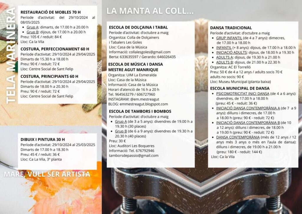 La majoria d'activitats començaran a la fi d'octubre en diferents ubicacions, com el Centre Social de Sant Felip (costura) o Ca la Vila (restauració de mobles o dibuix i pintura).