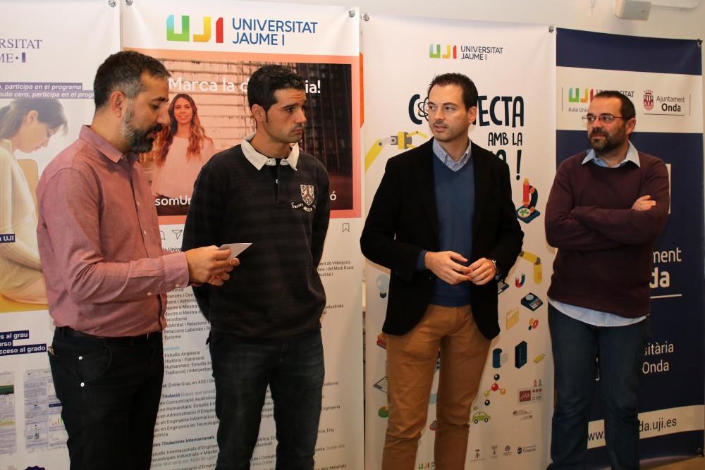 La vuitena edició de les jornades científiques de l’UJI Connecta amb la Ciència ha arribat a la localitat d’Onda, on avui s’han celebrat quatre tallers amb la participació de 86 estudiants de quart de l’ESO de l’IES Serra Espadà. L’alcalde d'Onda, Ximo Huguet; el regidor de Joventut, Asensio Blaya, i el director de l'Aula d'Onda, Joan Feliu, han visitat els tallers que s’han desenvolupat al Casal Jove.
