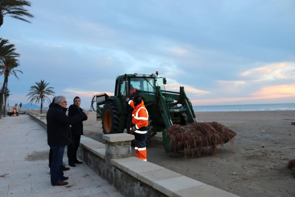Martínez ha comprobado junto a los ediles de Urbanismo y Servicios las tareas de limpieza intensivas en paseo marítimo y playas, que han arrancado ya hace un par de días y se prolongarán, "con toda probabilidad a lo largo de toda una semana".