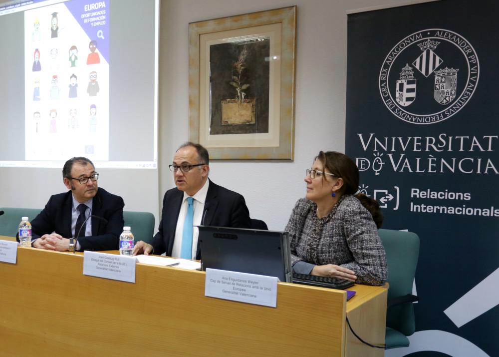 El delegado del Consell para la Unión Europea, Joan Calabuig, ha presentado en la Universitat de València la publicación 'Europa: oportunidades de formación y empleo', una guía elaborada por la oficina de información Europe Direct Valencia, y que recoge las oportunidades de desarrollo profesional a las que pueden optar los jóvenes valencianos.
