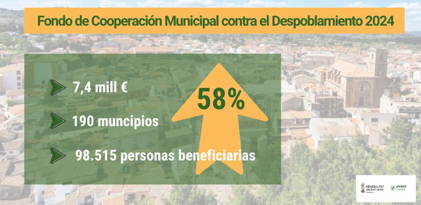 La Generalitat ha reforzado el Fondo de Cooperación Municipal contra el Despoblamiento, dedicando más recursos y extendiendo su alcance a un mayor número de municipios. En este sentido, el Consell destinará 7.406.035 euros a un total de 190 municipios en riesgo de despoblación repartidos por el territorio valenciano.