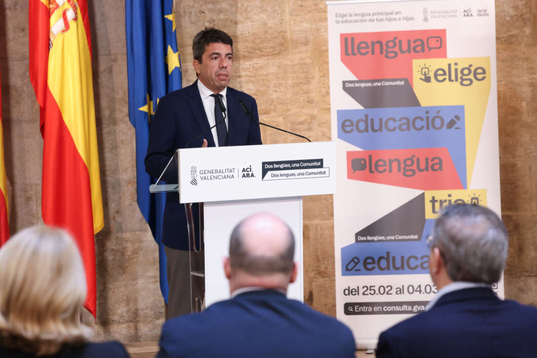 El president de la Generalitat, Carlos Mazón, ha subratllat que el Consell “garantix a 570.000 famílies la llibertat de triar la llengua base en l’educació dels seus fills” amb la primera consulta telemàtica, que se celebrarà del 25 de febrer al 4 de març, en la qual participaran les que corresponen a alumnat de 2n cicle d’Infantil, Primària o els tres primers cursos d’Educació Secundària Obligatòria (ESO).