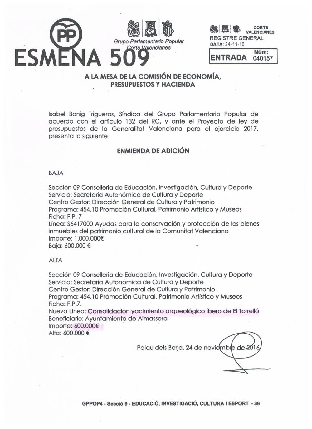 Sí ho va fer el PP l'any 2016 presentant esmena als pressupostos per a incorporar una partida de 600.000 euros que permeteren consolidar les restes i crear un museu de lloc. En comissió d'Hisenda, PSPV i Compromís, al costat de Podem votaven en contra de la proposta. “Ara”, ha postil•lat Felip, “Patrimoni també nega subvencions malgrat disposar d'un milió d'euros per a ajudar a la recuperació de jaciments”. “És evident”, ha considerat la regidora, “que per al Consell de Puig i Oltra, Almassora no existeix”.