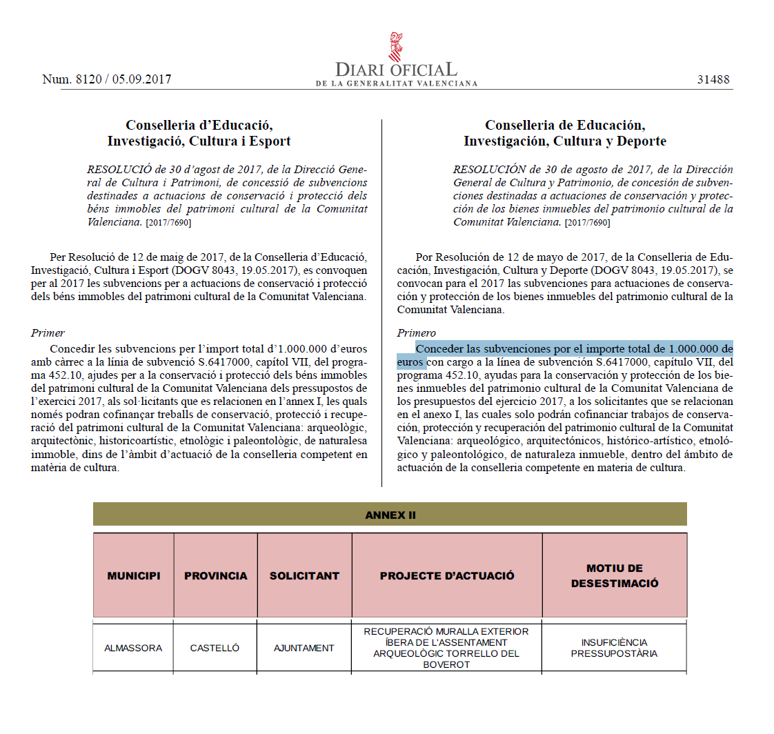 La Direcció general de Cultura i Patrimoni feia públic aquest dimarts en el Diari Oficial de la Comunitat Valenciana (DOCV) la concessió de subvencions a municipis per a conservar i protegir el patrimoni cultural. Amb un milió d'euros de fons, el Consell torna a donar l'esquena a Almassora i li nega pressupost per a recuperar la muralla exterior íbera de l'assentament.
