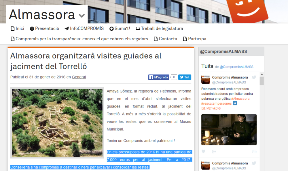 Durant el mandat del Partit Popular es van dur a terme treballs d'excavació i consolidació del jaciment que “Compromís va garantir que es reforçarien quan arribaren a l'alcaldia”. Des del 13 de juny de 2015 aquesta formació política governa en paral•lel amb el PSPV i “ni d'uns ni d'uns altres hem vist exigir al Consell inversió”.