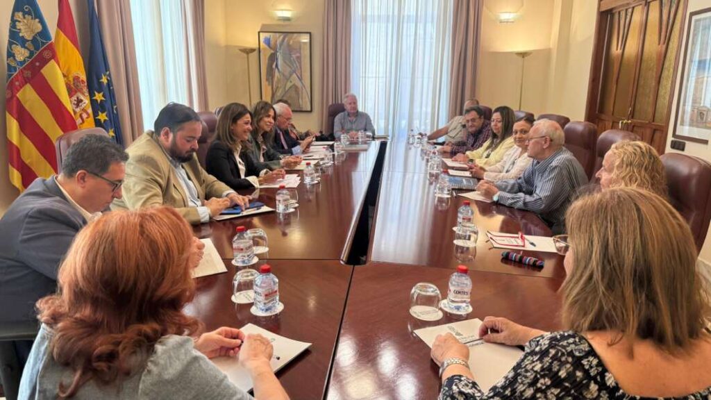 La consellera de Justícia, Transparència i Participació, Nuria Martínez, acompanyada per la secretària autonòmica de Transparència i Participació, Carmen Uriol, i el director general de Participació, José Tárrega, s’han reunit amb la junta directiva de la Federació de Cases i Centres Regionals d’Espanya a Castelló.