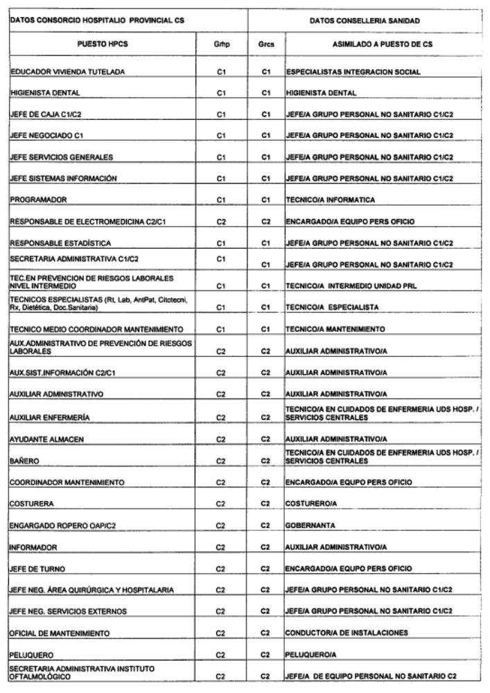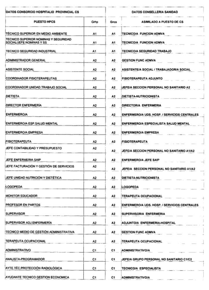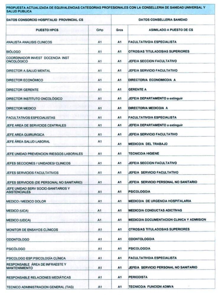 El Consorcio está proponiendo desde primeros de año un catálogo de asimilación de las categorías profesionales del Consorcio con las de la Consellería de Sanidad, un empeño en el que insiste a pesar de que el Director General de Recursos Humanos y Económicos de la Consellería de Sanidad, en un escrito remitido en fecha 13 de febrero de 2017, respecto de la disposición adicional trigésima primera de la Ley de presupuestos de la Generalitat