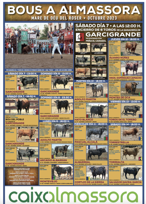 Sens dubte, un dels plats estrela serà el tancament del dissabte 7 d'octubre, a les 12.00 hores, amb sis bous cerrils patrocinat per la penya El Caragol, que celebra el seu 50é aniversari. La coneguda ramaderia de Garcigrande fa el seu debut popular, ja que a penes s'han bregat bous d'aquest ferro pels carrers. “Des d'ací vull agrair la labor i el gran esforç que fan totes i cadascuna de les penyes d'Almassora per contribuir al fet que el cartell taurí siga considerat pel món del bou al carrer com a plaça de primera categoria”, ha destacat Soler.