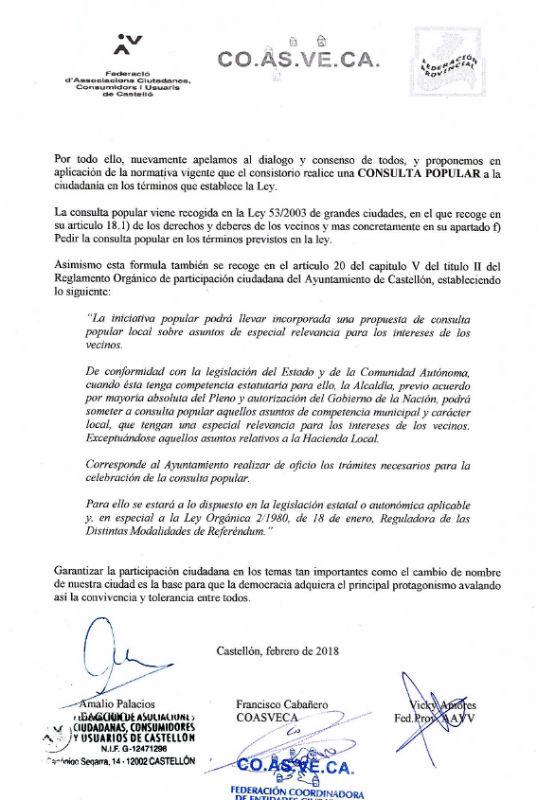 La Federación de Asociaciones Ciudadanas, Consumidores y Usuarios de Castellón, Coasveca, ha registrado un escrito dirigido a la alcaldesa de Castellón, en el que reclaman que se ponga en marcha una consulta popular para decidir si se reduce solo a su expresión en valenciano el nombre de la ciudad. Las asociaciones firmantes reivindican la participación de toda la ciudadanía en esta decisión.