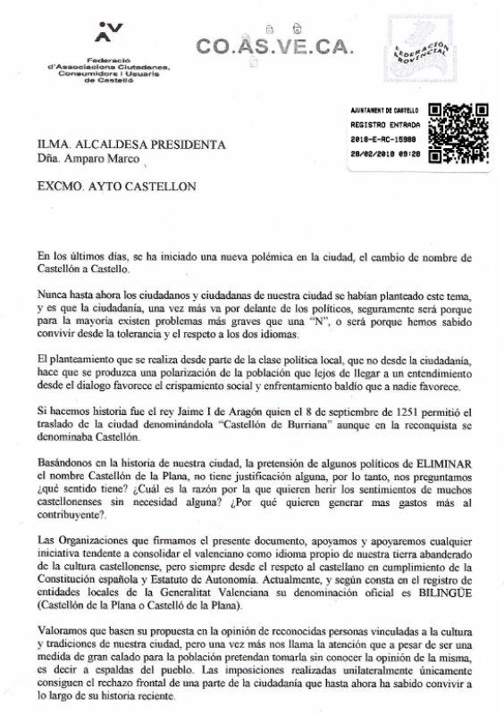 El escrito, pasado por el registro municipal con fecha 28 de febrero indica, que según la historia de la ciudad “la pretensión de algunos políticos de eliminar el nombre de Castellón de la Plana, no tiene justificación alguna, por lo tanto nos preguntamos ¿qué sentido tiene? ¿cuál es la razón por la que quieren herir los sentimientos de muchos castellonenses sin necesidad alguna? ¿Por qué quieren generar más gastos de los contribuyentes?”.