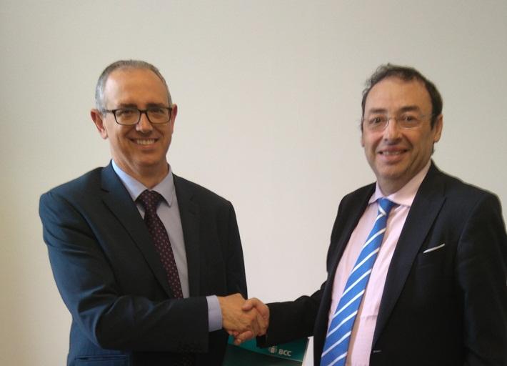 El director de Banca de Empresas del BCC-Grupo Cooperativo Cajamar, Ricardo García Lorenzo, y el presidente de la Asociación Española de Fabricantes de Maquinaria y Bienes de Equipo para la Industria (Asebec), Juan Vicente Bono, han firmado un acuerdo de colaboración con el objetivo de facilitar condiciones financieras ventajosas para la actividad de las empresas integradas en este colectivo, que reúne a la mayoría de fabricantes españoles de maquinaria para el sector cerámico.