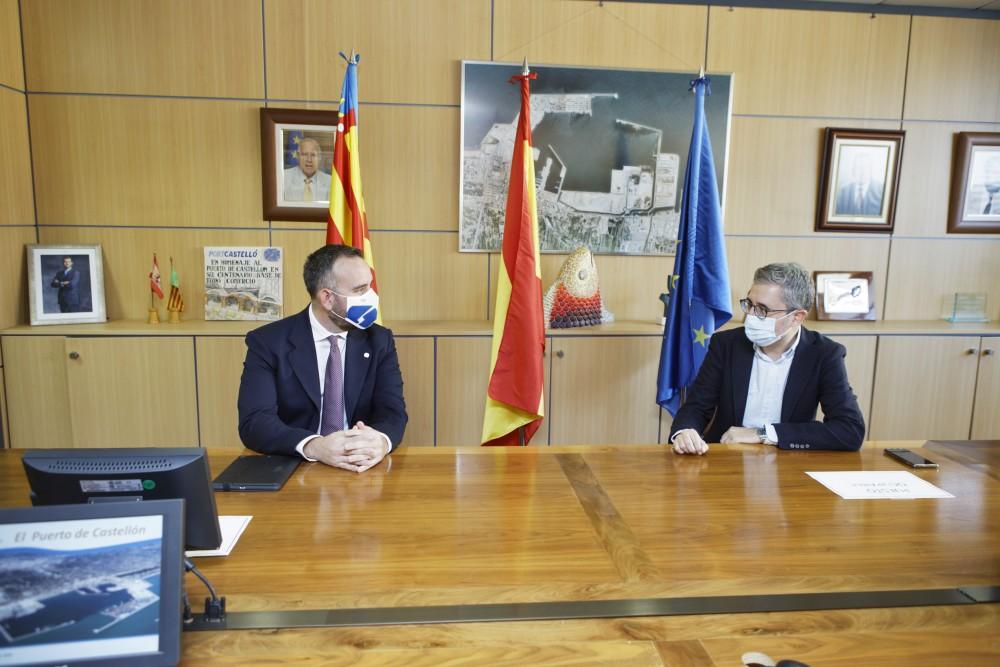 El conseller, Arcadi España, ha visitado esta mañana al presidente de la Autoridad Portuaria de Castelló, Rafa Simó. Según ha manifestado el conseller España, se ha tratado de un primer encuentro para valorar el proceso de crecimiento y de diversificación en el que se encuentra el puerto, el cluster energético, al hortofrutícola, el cerámico; y las actuaciones para crecer con la estación Intermodal y el acceso Ferroviario