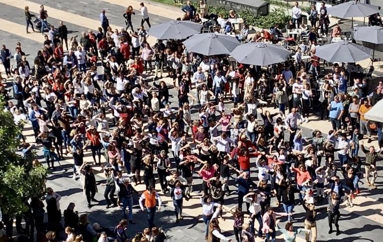 La plaza Pere Cornell de Almassora ha acogido este mediodía un multitudinario ‘flashmob’ para celebrar el Día Internacional de la Mujer. Decenas de personas se han unido a esta improvisada actuación para bailar juntas unas sevillanas coincidiendo con el 8 de Marzo.