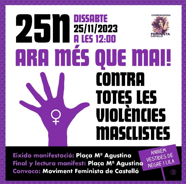 Como cada año, la Coordinadora Feminista de Castellón convoca una manifestación el 25 de noviembre con motivo del Día Internacional de la Eliminación de la Violencia contra las Mujeres. Este año con el lema: “Contra todas las violencias machistas, ahora más que nunca”, recorrerá las principales calles de la ciudad.