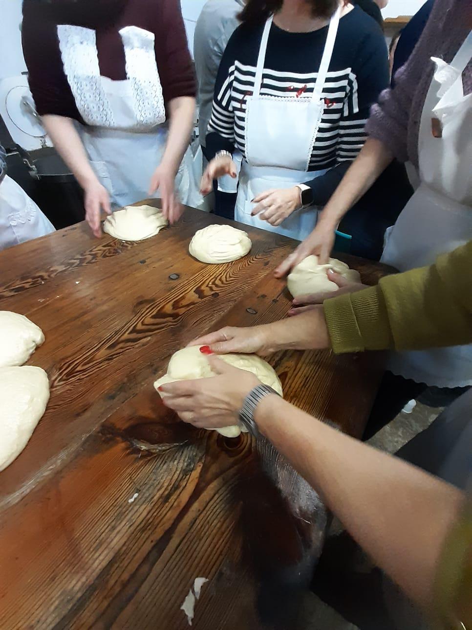 Mientras los miembros de la Santantonà fueron a buscar la leña que vestirá la imponente barraca, las mujeres se repartieron entre los dos hornos de Forcall para amasar.