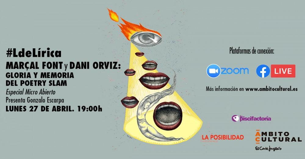 Este lunes 27 de abril Ámbito Cultural de El Corte Inglés celebra un nuevo #LdeLírica, un ciclo de poesía que comenzó en 2018 en las salas de Ámbito, y por el que han pasado reconocidos poetas, músicos y colectivos poéticos. Bajo la dirección de Gonzalo Escarpa, hoy estarán charlando con él y actuando, Marcal Font y Dani Orviz. El tema: Gloria y Memoria del Poetry Slam.