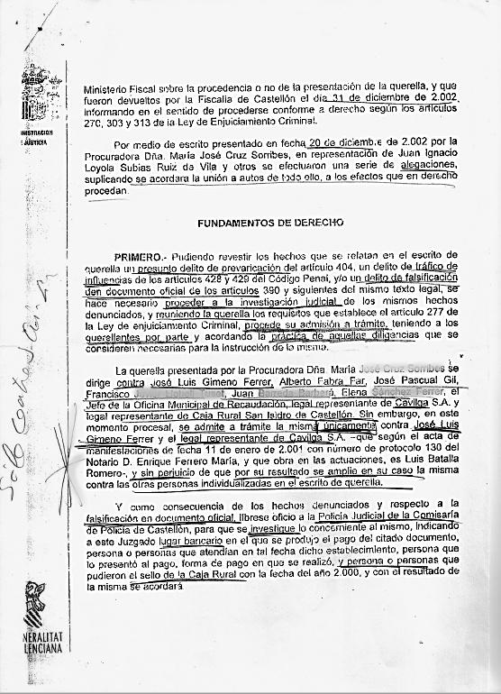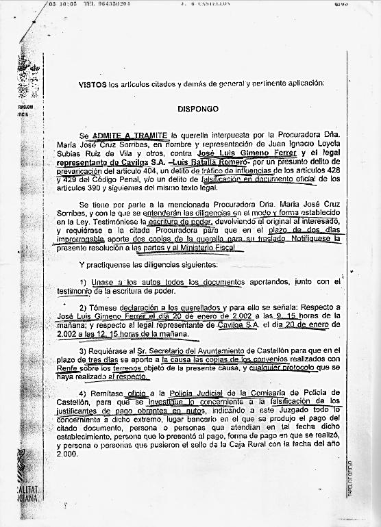 El 2 de enero de 2003 el magistrado del Juzgado de Instrucción nº 1 de Castellón admitía a trámite la querella. Inicialmente, el juez restringió inicialmente sus actuaciones sobre José Luis Gimeno Ferrer, alcalde de Castellón y el representante legal de Calviga, filial de Lubasa, Luis Batalla, aunque posteriormente podía ampliar las diligencias hacia el resto de las personas incluidas en la denuncia.