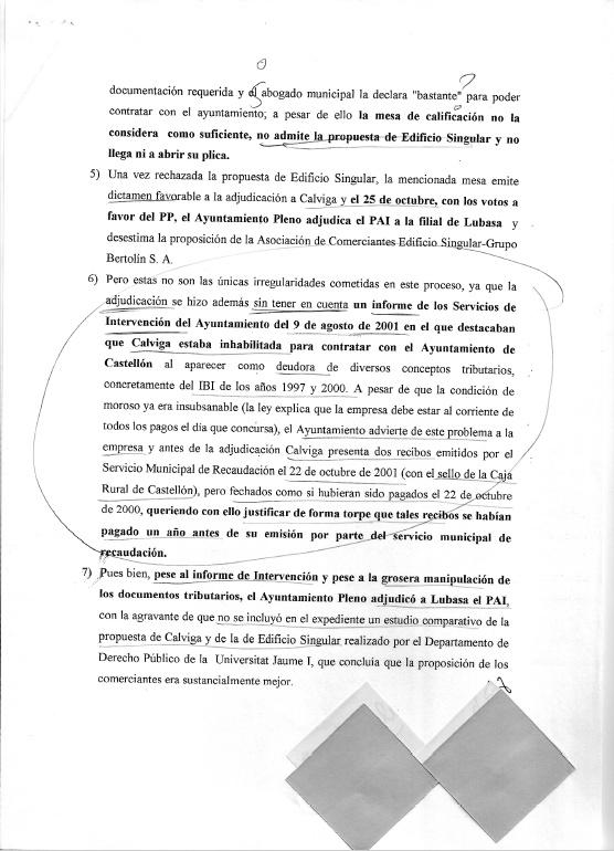 Manifestaban, que Calviga no podía presentarse a esta licitación porque no estaba al corriente de los pagos relativos a los años 97 y 2000, según constaba en un informe del viceinterventor municipal. Ignacio Subías y Miguel Alcalde afirmaron, que Calviga solucionó este problema con un documento respaldado por la Caja Rural, con fecha del 2000, cuando el pago se produjo en el 2001 con todos los recargos, por lo que indicaban que se había producido “falsedad en documento público”.