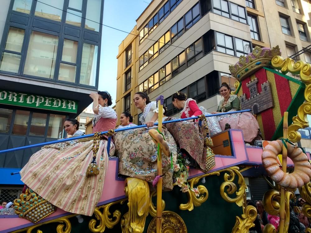 Ha abierto el Coso Multicolor la carroza de la Germandat dels Cavallers de la Conquesta, con Na Violant 2019, Andrea Sánchez, y sus dones de companya y acto seguido iban las carrozas de las comisiones de sector, de la 1 a la 19.