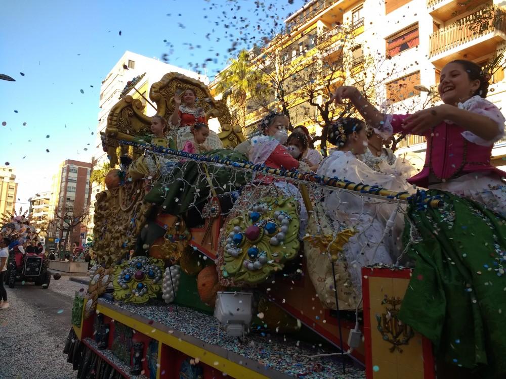 Miles de niños y mayores han disfrutado esta tarde de la batalla de confeti en la Avenida del Rey don Jaime con la participación de 23 carrozas en las que iban los representantes de todas las comisiones de sector, así como Na Violant, Andrea Sánchez, y las reinas de las fiestas infantil, Natalia Collazos y Natalia Palacio