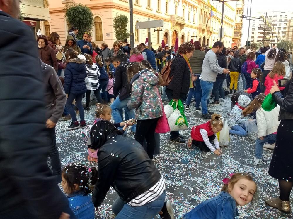 Ha sido a partir de la segunda vuelta cuando ha empezado la verdadera fiesta. Niños, niñas y mayores de todas las edades no han parado de reclamar su 'ración' de confeti a los integrantes las 19 comisiones de sectores y por supuesto a las damas de la ciudad y las reinas, incluso había alguna pancarta que reclamaba confeti a alguien en particular.