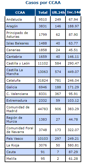 Por comunidades, Madrid cuenta ya con 44.783 afectados y 5.972 muertos, seguida de Cataluña con 31.824 personas infectadas por el coronavirus y 3.231 fallecidas por esta causa. Asimismo, Andalucía tiene con 9.510 afectados y 691 muertos; Aragón, 3.831 infectados y 409 fallecidos; Asturias registra 1.799 contagiados y 121 muertos; y Baleares, 1.488 afectados y 97 muertos.