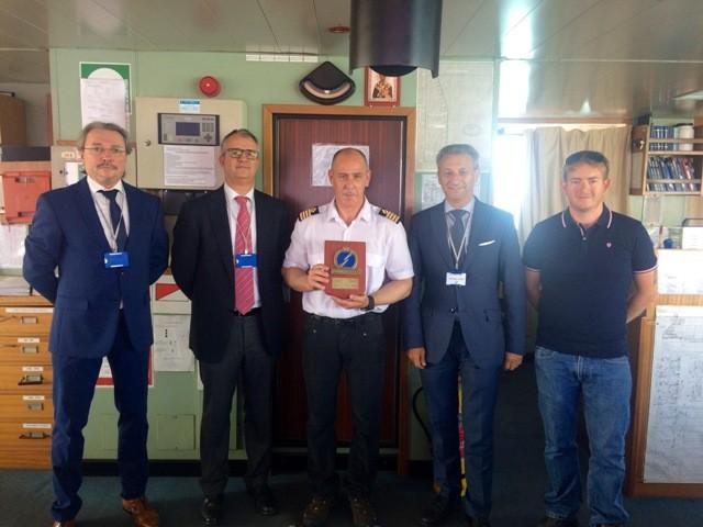 El presidente de la Autoridad Portuaria de Castellón, Francisco Toledo, ha hecho entrega de una metopa al capitán del barco, Krzysztof Majdzinski, con motivo de su primera escala en el puerto de Castellón.