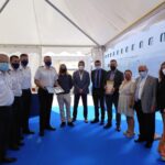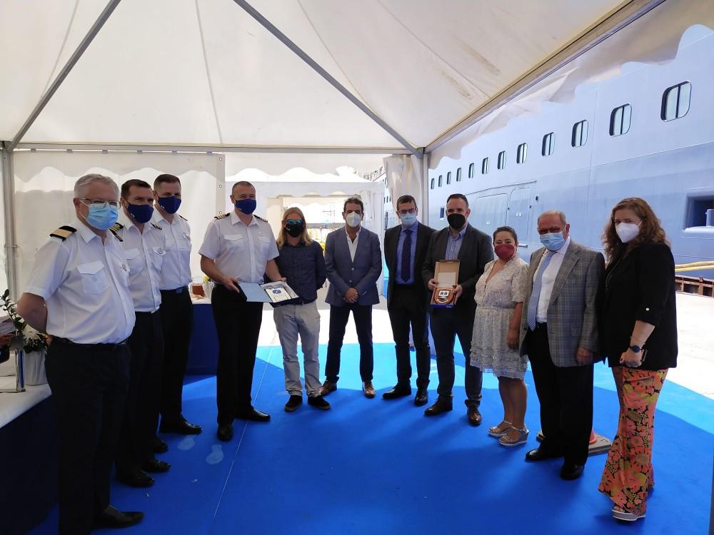 El presidente de la Autoridad Portuaria de Castellón, Rafa Simó, acompañado del director de PortCastelló, José María Gómez, y la concejala de Turismo, Pilar Escuder, ha hecho entrega de una metopa al capitán del buque como recuerdo de su primera escala en el puerto de Castellón.