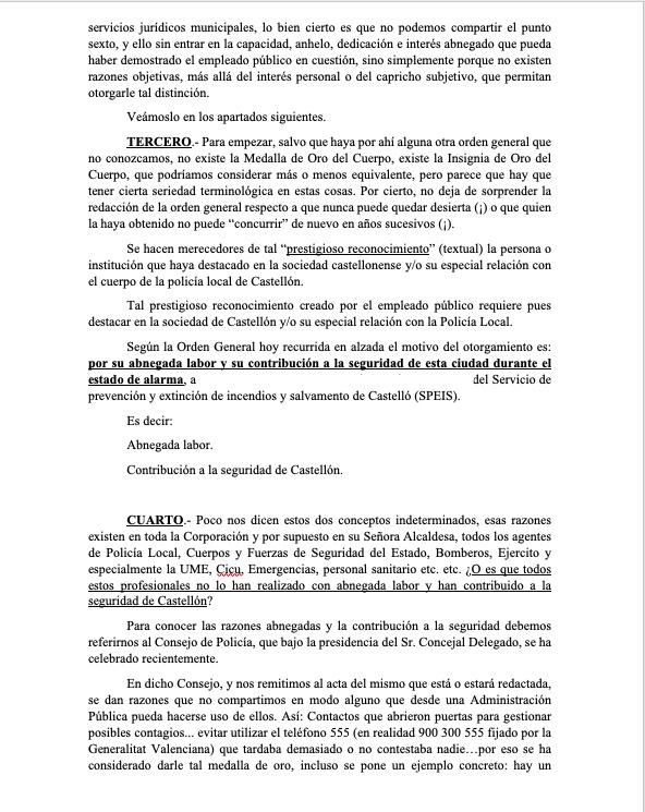 Según ha podido saber Castellón Información, la persona a la que afecta este recurso, ha sido considerado por sus compañeros como indigna de tal reconocimiento. Y la razón que alegan, es que, desde su papel de ‘mediador’ durante lo más duro de la pandemia de la Covid y el estado de alarma, fue de las pocas personas que pudo permanecer cómodamente en un despacho, sin asumir riesgos en la calle, como si hicieron el resto de los agentes, y con una ‘tarea’ que los otros agentes califican de gestión telefónica y poco más. Entienden también, que la propuesta de su condecoración ha sido ‘interesada’. Y finalmente, declaran el único mérito que se le atribuye es el de ‘conocer a gente relevante’, para desviar por este sistema las mediaciones de casos de Covid que deberían haberse gestionado a través de la vía oficial: el teléfono 900 300 555 fijado por la Generalitat Valenciana.