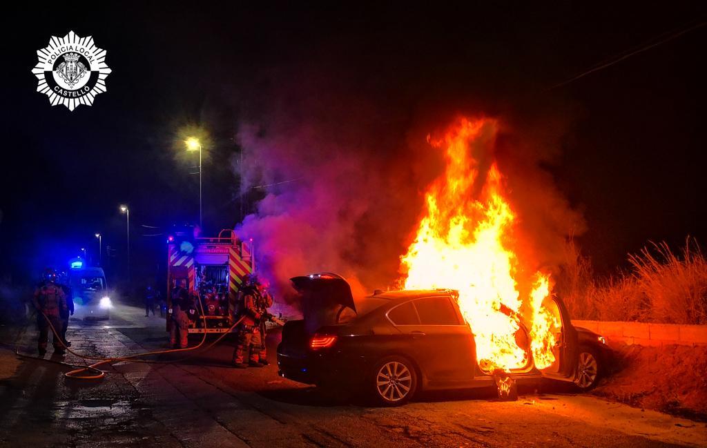 Cuatro personas heridas, con pronóstico leve y un vehículo completamente calcinado, ha sido el resultado de un accidente de tráfico que se produjo en la cuadra Segunda de Castelló, en el Grupo San Agustín y San Marcos. Al parecer, el siniestro se produjo a raíz de que una furgoneta se atravesara en una intersección, en la trayectoria de un turismo. La colisión fue tan violenta, que el turismo comenzó a arder por la parte delantera.