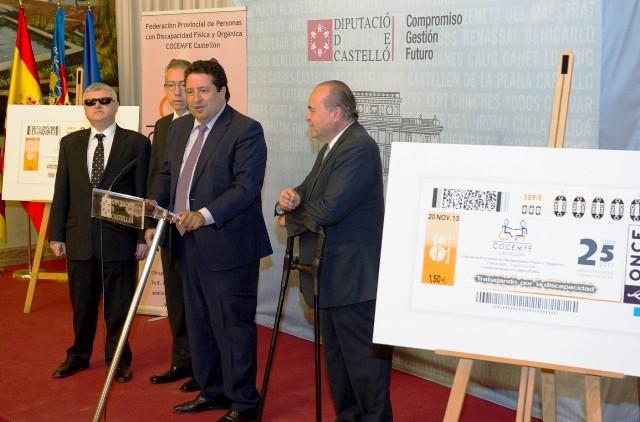 El salón de Recepciones de la Diputación de Castellón ha acogido esta mañana la presentación del cupón de la ONCE que conmemora el 25 aniversario de la Federación de Personas con Discapacidad Física y Orgánica de la Provincia de Castellón (Cocemfe-Castellón) y que se distribuirá el próximo miércoles 20 de noviembre.