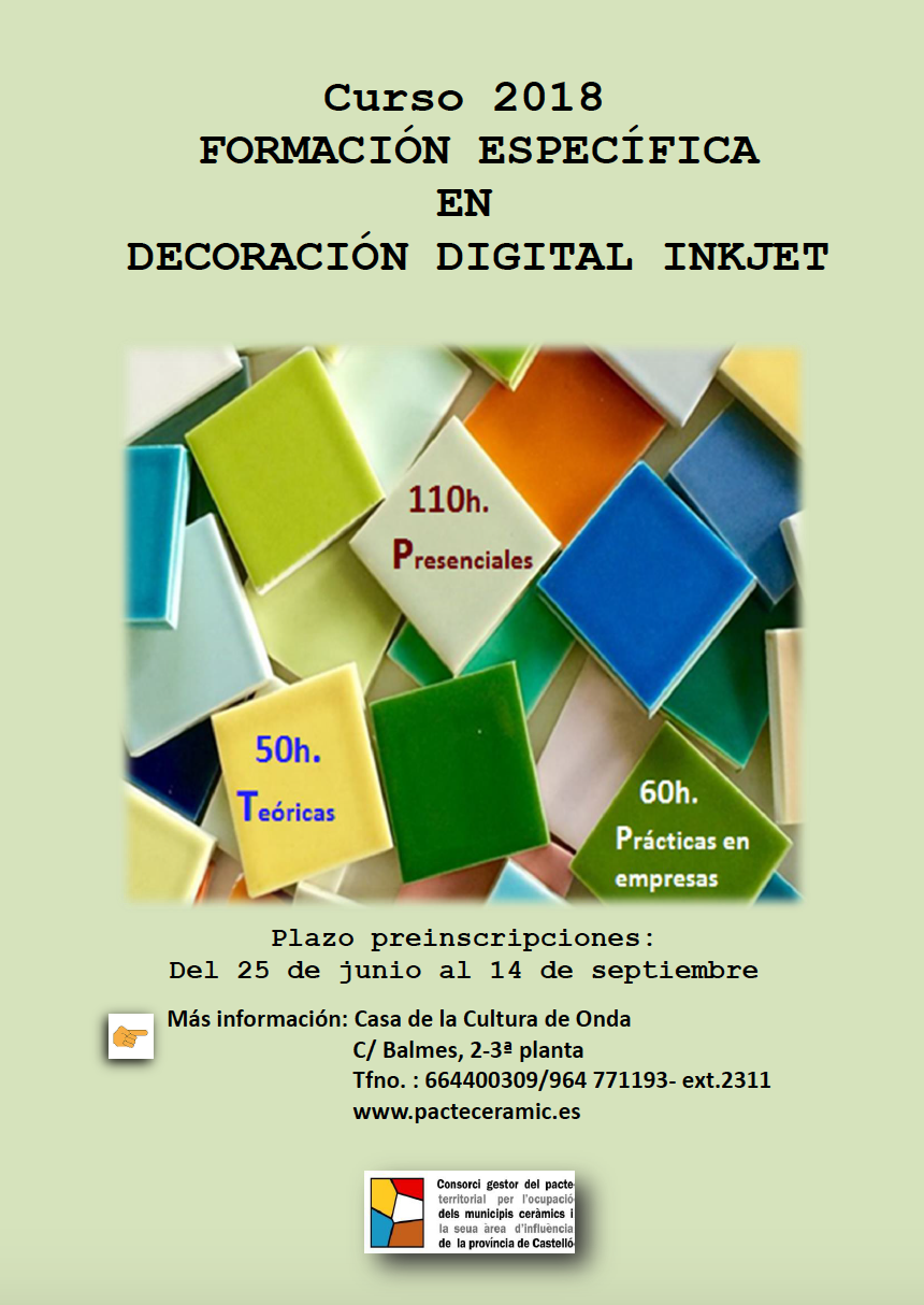 La formació compta amb 50 hores de teoria i 60 de pràctiques no laborals en empreses i pretén proporcionar els coneixements necessaris a aquelles persones que han perdut la seua ocupació en la indústria ceràmica i desitgen actualitzar coneixements i competències específiques per a treballar com a operari en línies d'esmaltat i impressió digital Inkjet per al sector ceràmic. En el curs, que forma part del projecte formatiu del Pacte, s'abordaran els aspectes bàsics fonamentals de les operacions bàsiques de la línia d'esmaltat, així com dels controls que s'han de realitzar per al compliment de la qualitat exigida en aquesta operació. També es coneixeran les tècniques utilitzades per a l'aplicació dels engobes i dels esmalts, els possibles defectes de procés i mesures correctores i també es tractarà la tecnologia Inkjet.
