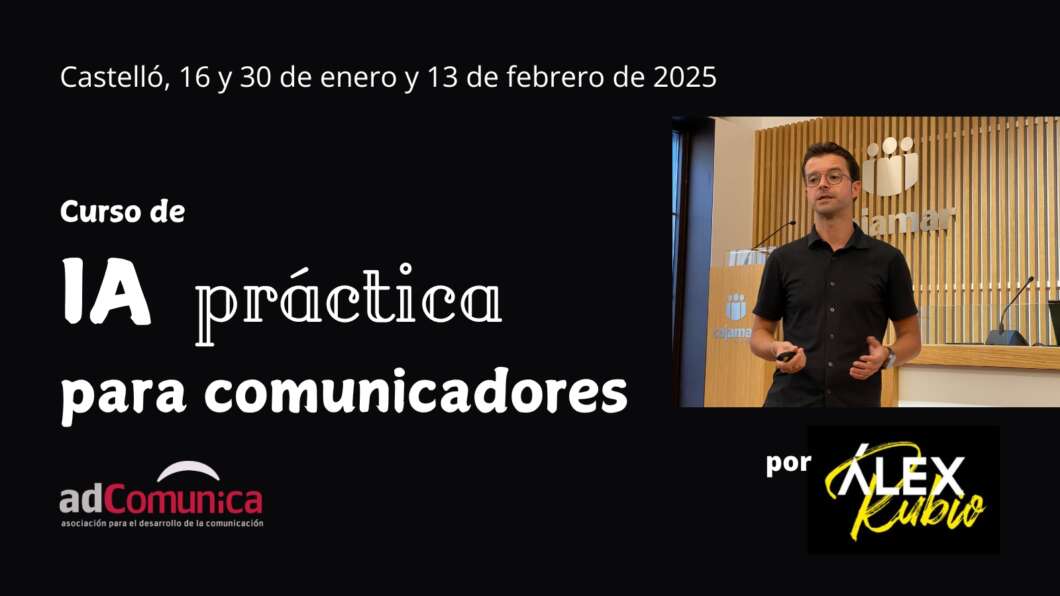La Asociación para el Desarrollo de la Comunicación, AdComunica ha vuelto a convocar un curso práctico dirigido para comunicadores, sobre el funcionamiento de la Inteligencia Artificial. El curso se dirige a socios, pero también está abierto al público. Será impartido por Alex Rubio, durante tres jornadas con sesiones de dos horas cada una de ellas: 16 y 30 de enero y 13 de febrero. La cuota de socios es de 40 euros; y para el público interesado no socio, de 60 euros.