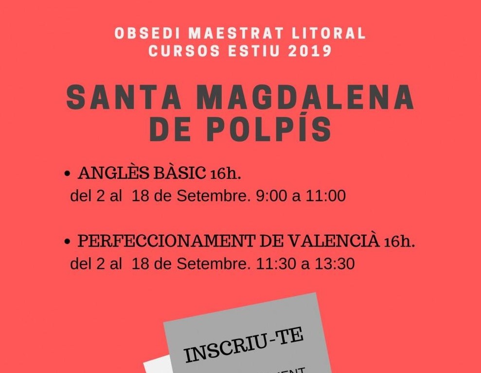 L´Obsedi Maestrat Litoral informa que, dilluns que ve, 2 de setembre es posaran en marxa diferents cursos gratuïts a Santa Magdalena, dins del programa de formació del Pacte Territorial per l'Ocupació Maestrat Litoral. Concretament s'ofereixen cursos de 16 hores de perfeccionament de valencià, orientat a la gramàtica i conversa i d'anglés bàsic.