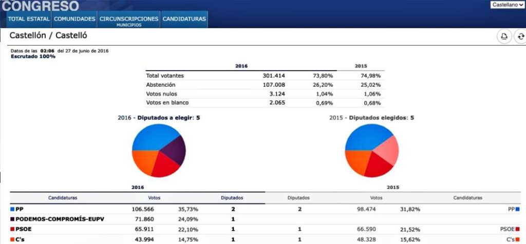 Las nuevas Elecciones Generales generaron una abstención del 30,16% en la globalidad del territorio nacional, aunque en la Comunitat Valenciana y en la provincia de Castellón fue mucho menor.