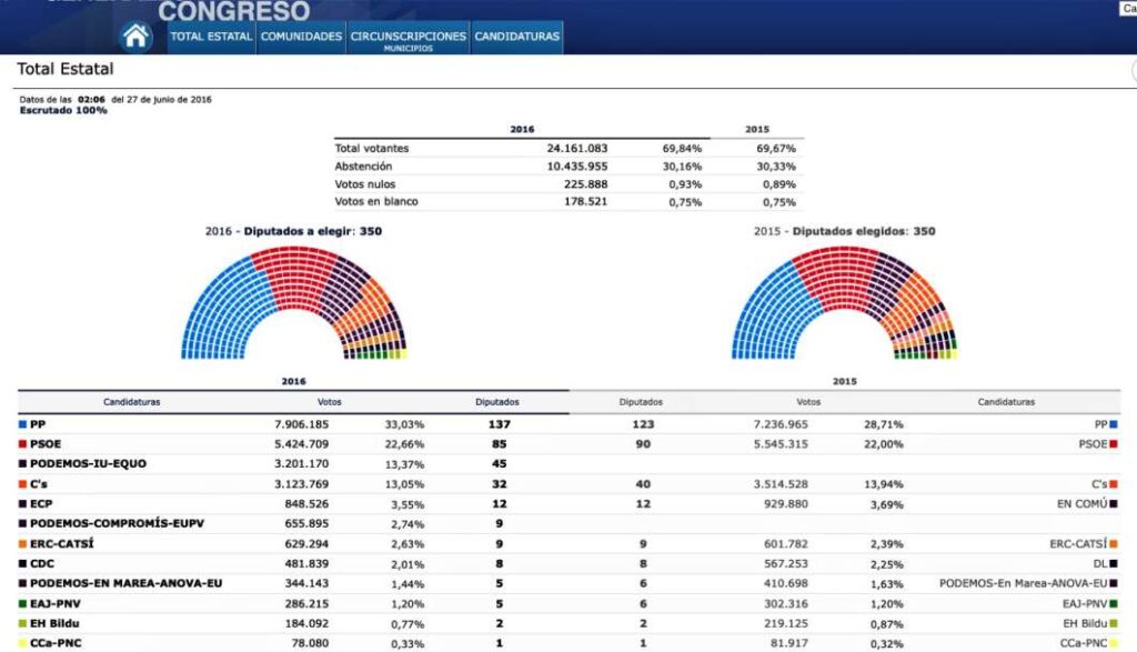 El Partido Popular volvía a ser el partido más votado en España, liderado por Mariano Rajoy, pero con una mayoría simple de 123 diputados en el Congreso y mayoría absoluta en el Senado. El PSOE, liderado por Pedro Sánchez con 90 escaños. Podemos, con Pablo Iglesias al frente se presentaba por primera vez a las elecciones generales y obtenía 42 escaños, aunque, sumados a sus coaliciones de izquierda en los distintos puntos del país lograba 69. Ciudadanos, de Albert Ribera entraba con fuerza y con 40 escaños