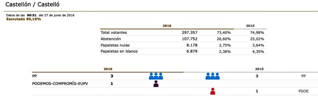 En la provincia de Castellón el PP también se recuperaba un poco, pero se quedaba en los dos diputados, Podemos-Compromís-Eupv, 1, PSOE 1 y Ciudadanos 1.