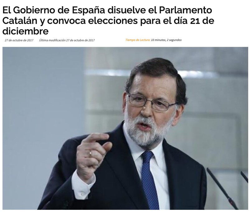"El Parlamento de Cataluña aprobó el 27 de octubre de 2017 la declaración unilateral de independencia. Ese mismo día el Gobierno de España presidido por Mariano Rajoy intervino la autonomía de Cataluña mediante la aplicación del artículo 155 de la Constitución española. Mariano Rajoy convocó un consejo de ministros extraordinario en el que se aprobó el cese del presidente de la Generalidad, Carles Puigdemont y del resto de miembros del Gobierno de la Generalidad, la disolución del Parlamento de Cataluña y la convocatoria de elecciones autonómicas catalanas para el 21 de diciembre de 2017".