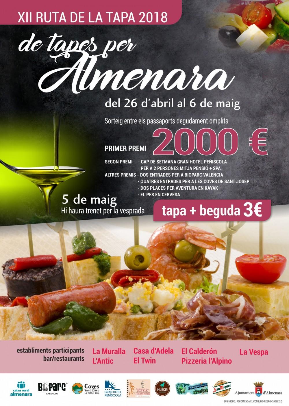 cartel ruta 2018A partir de demà i fins al 6 de maig set bars i restaurants d'Almenara participaran en la XII edició de la Ruta de la Tapa d'Almenara amb l'objectiu de promocionar els diversos locals del municipi, així com la gastronomia, proporcionant la tapa més la beguda a un preu de 3 euros. En concret, enguany en la ruta organitzada des de l'Ajuntament d'Almenara participen els establiments de la Muralla, L'Antic, Casa d'Adela, El Twin, El Calderón, Pizzeria l'Alpino i La Vespa.