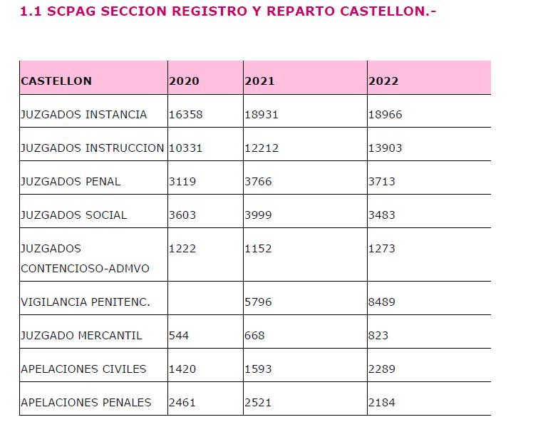 La memoria publicada por el Tribunal Superior de Justicia de la Comunitat Valenciana relativa al año 2022 deja patente la necesidad de dotar con más recursos humanos y materiales las distintas secciones de la Audiencia Provincial de Castellón, así como de los partidos judiciales de la provincia. En concreto, el documento aporta que a pesar de que la entrada en funcionamiento de la Sección Cuarta de la Audiencia Provincial ha colmado la petición que venía haciéndose en los últimos años, “es patente la necesidad de que cada una de las dos secciones civiles cuente con una plantilla de cuatro magistrados, en lugar de los tres actuales” y por ello aseguran que “esto supone el incremento en dos magistrados de la planta judicial”.