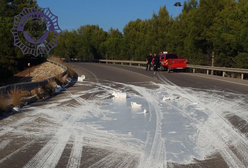 El equipo de Atestados e Investigación de Accidentes de la Policía Local de Castellón ha localizado al conductor del camión que ha derramado parte de su carga y, tras su identificación, ha confeccionado diligencias judiciales contra el conductor por un presunto delito contra la seguridad vial por derramar sustancias deslizantes en la vía.