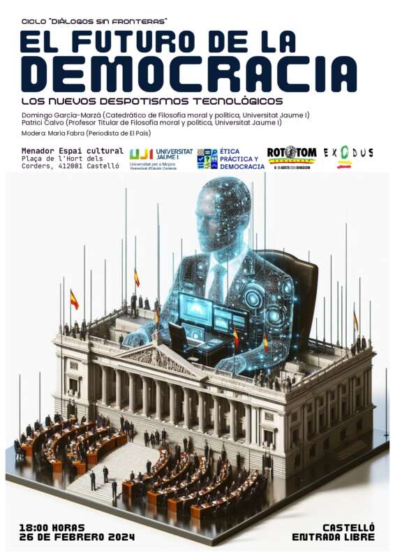 Bajo el título ‘El futuro de la democracia. Los nuevos despotismos tecnológicos’, la sesión acercará hasta el Menador Espai Cultural de Castelló, el lunes 26 de febrero (18.00 horas) a dos voces expertas en filosofía moral y política, la del catedrático de Ética de la Universitat Jaume I de Castelló, Domingo García, y la del doctor en Filosofía Moral por la UJI y profesor, Patrici Calvo, para analizar la disrupción entre el activismo político ético y la dictadura del algoritmo a la que se enfrenta la democracia del siglo XXI.