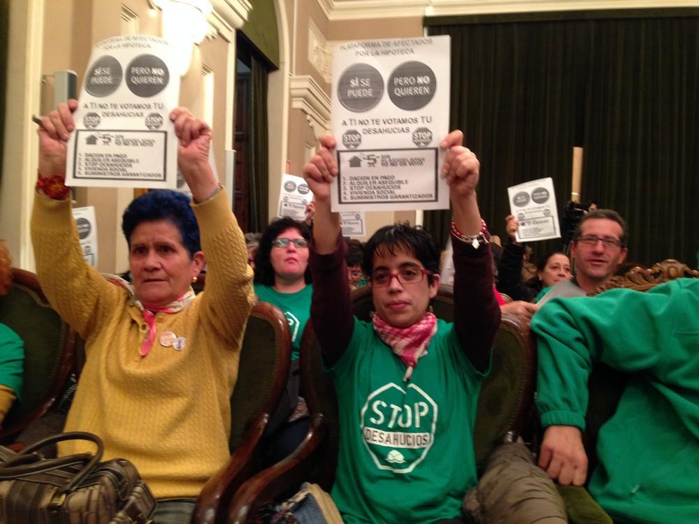 A partir de ahí la historia se complica. Fuerzas de Seguridad asaltaron ayer estas viviendas para proceder al desalojo de las familias que habían entrado a vivir en ellas.PAH Pleno Ayuntamiento 17XII!5 (58)