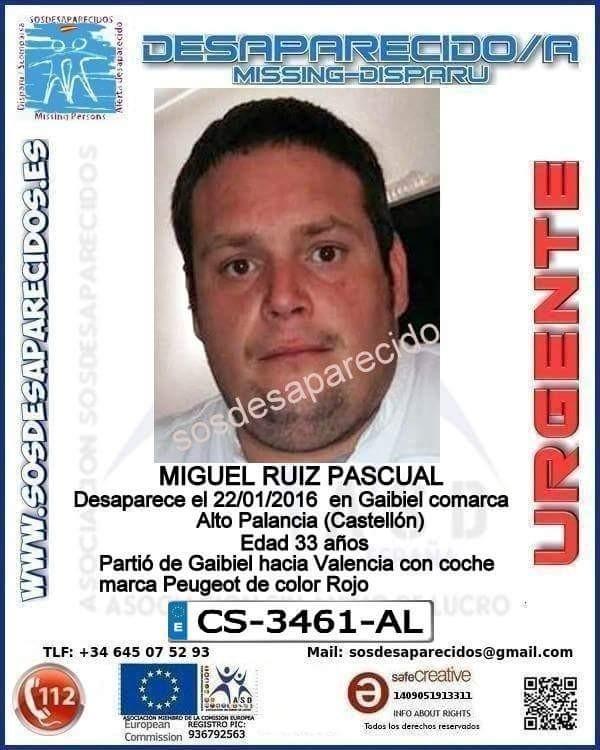 Según el citado mensaje, MRP desapareció el pasado 22 de enero en Gaibiel, comarca del Alto Palancia de Castellón cuando se dirigía a Valencia con un vehículo marca Peugeot, de color rojo´.
