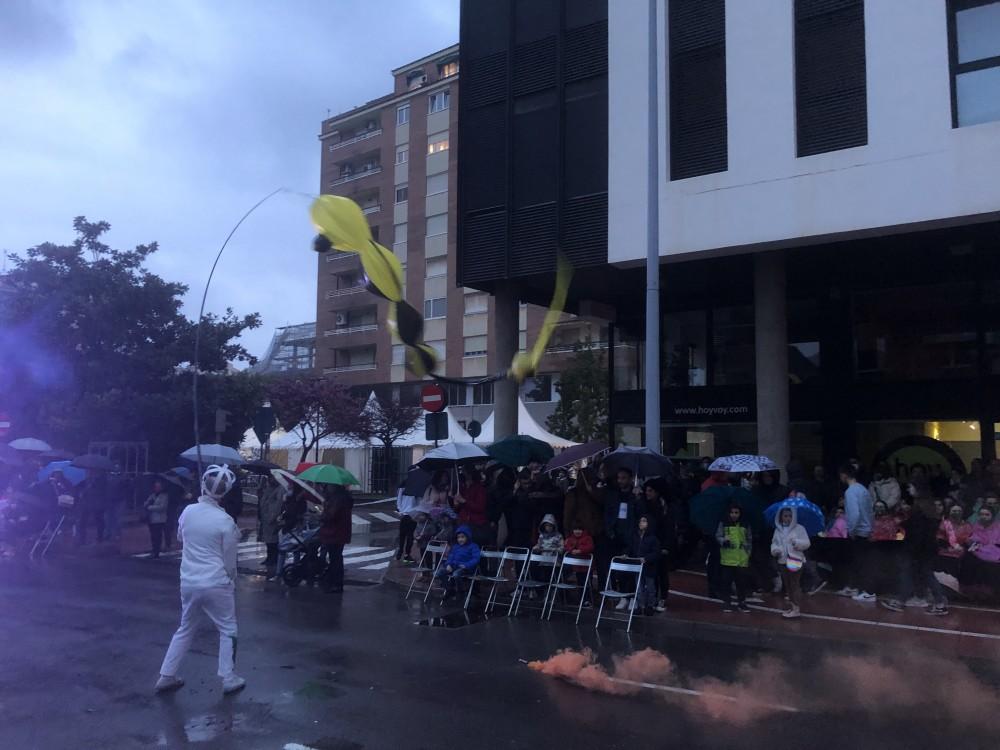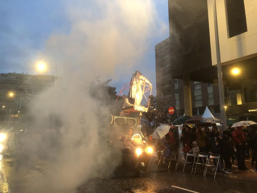 Al inicio del pasacalle eran pocas las chispas que caían y se ha decidido seguir adelante, pero una vez avanzado el desfile la lluvia se ha acrecentado. A pesar de este inconveniente, las carrozas, batucadas, charangas y otros participantes han continuado con su espectáculo hasta el final.
