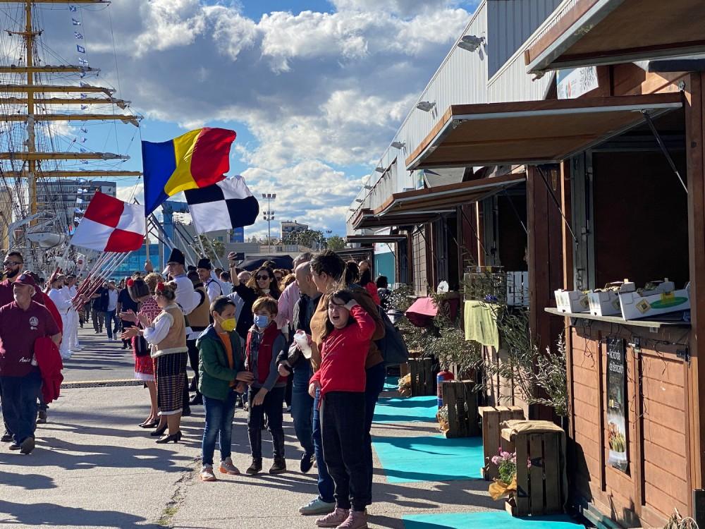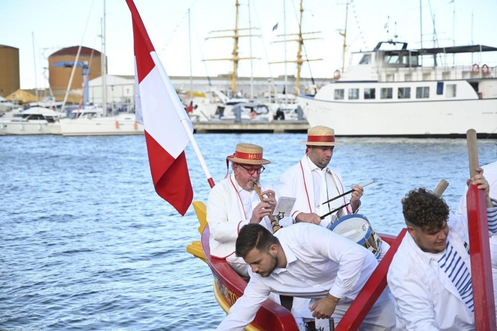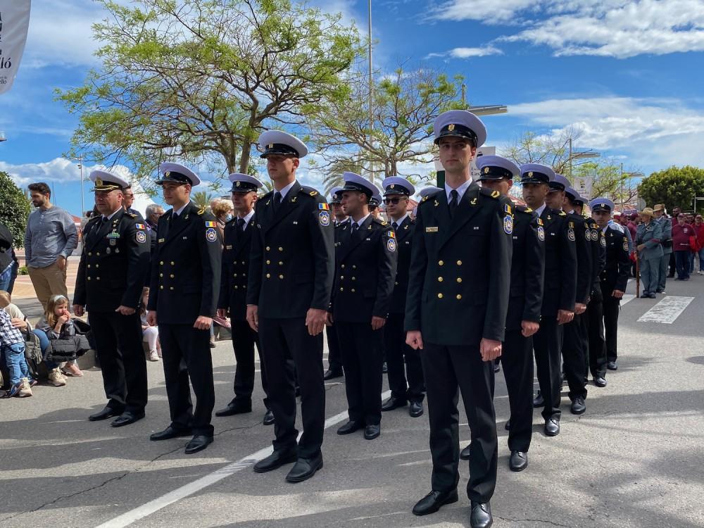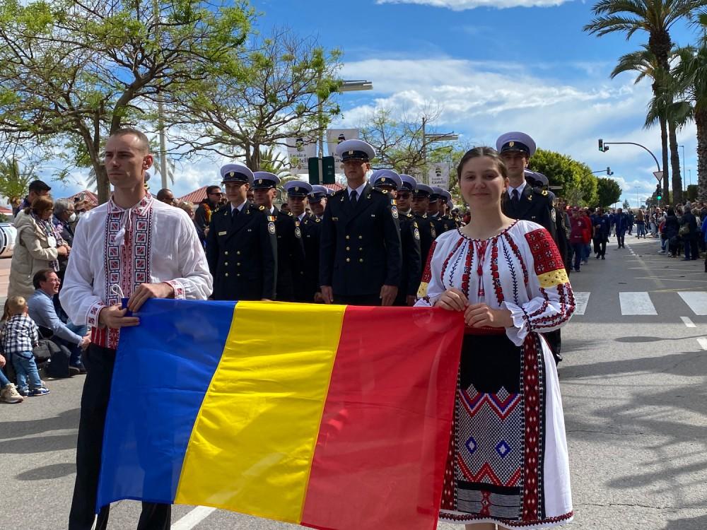 width=Desfiló la representación de la ciudad francesa de Sète, con los portadores de las varas y los escudos que utilizan para batirse en las Justas en el mar. También la Asociación Cultural rumana, con una gran bandera de Rumanía, delante de los marinos que forman parte de la tripulación del Mircea.