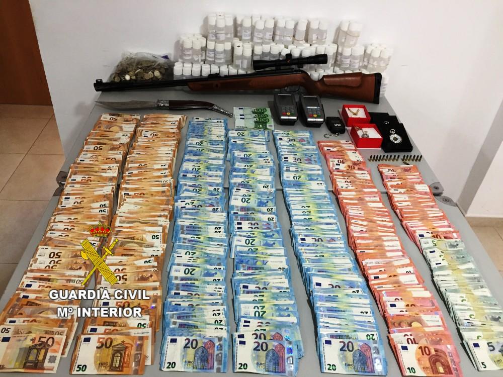 Los Guardias Civiles tras solicitar el correspondiente mandamiento judicial, accedieron a la vivienda, la cual tenía grandes medidas de seguridad, encontrando en su interior 190 envases con metadona líquida, 20 gramos de marihuana, 1 báscula de precisión, 37.800 euros en efectivo, 1 lámpara para detectar billetes falsos, 2 datafonos, libretas con anotaciones de deudas de compradores, 1 puñal de grandes dimensiones y 1 carabina del calibre 5,5.
