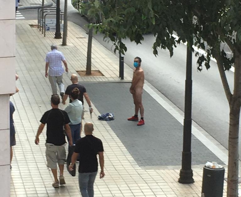 Ataviado con una mascarilla y zapatillas rojas, el individuo se ha desnudado frente al edificio llamando la atención de todo el que pasaba por el lugar