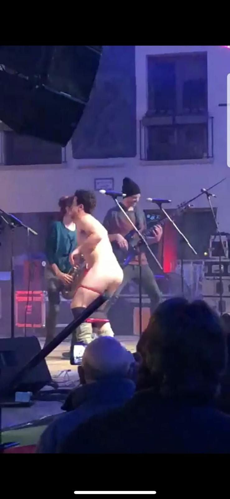 Pero la cosa 'se fue de las manos' a medida que transcurrían las horas y se salió de todo pronóstico cuando, en la Plaza Mayor, llena de familias y con menores que seguían el espectáculo, el cantante del grupo que actuaba decidió obsequiar al auditorio con lo mejor que tenía a mano... un desnudo integral con todas sus letras.
